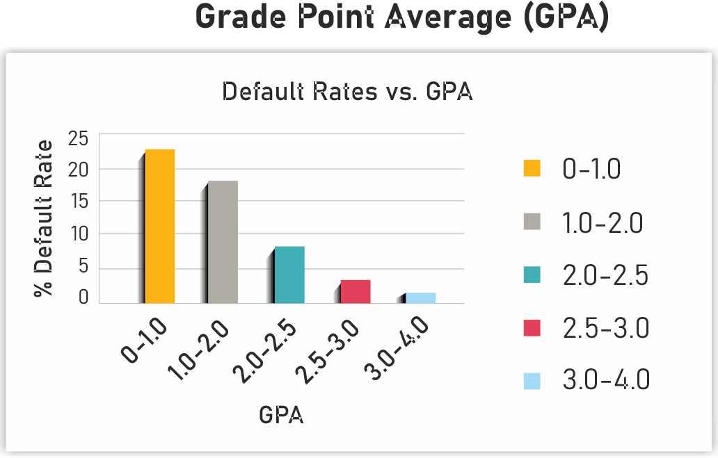 The academic performance is suggestive of loan repayment ability of a student (see the graph), hence as a banker you need to have data of students on their academic grade point average which help you to make a sound loan sanctioning decision. Source:Student Loan Default at Texas A&M University